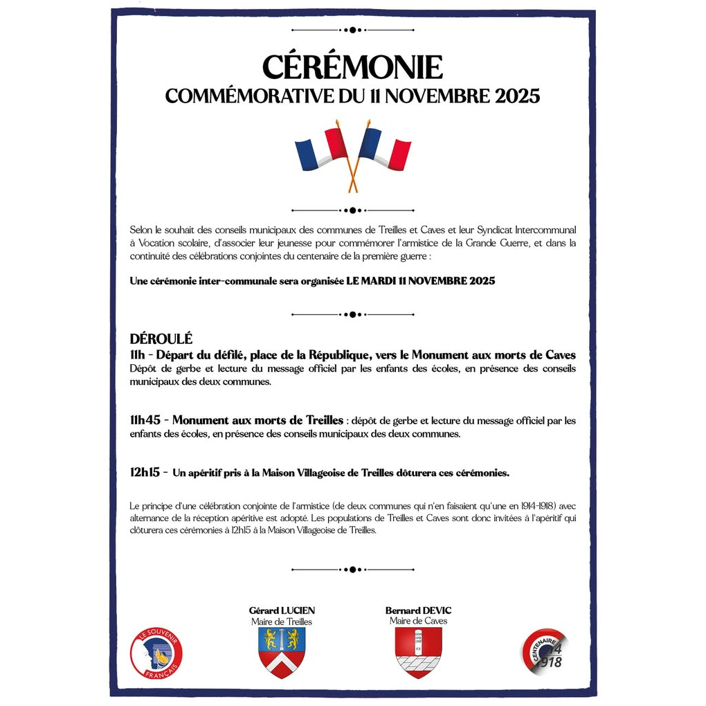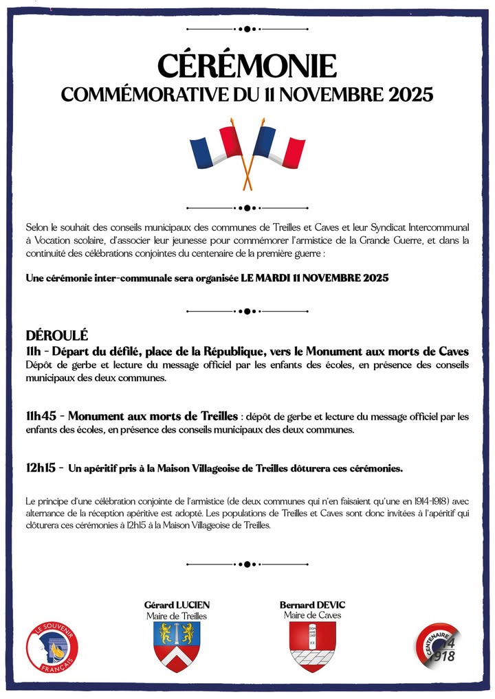 Les populations de Treilles et Caves sont donc invitées à l’apéritif qui clôturera ces cérémonies à 12h15 à la Maison Villageoise de Treilles.